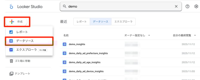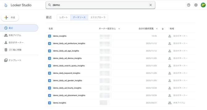Looker Studioのトップの「データソース」のタブに、「再利用可能なデータソース」なデータソース一覧が表示されます