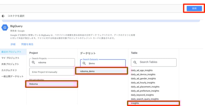 ③BigQueryの詳細画面で、以下をそれぞれ選択してください