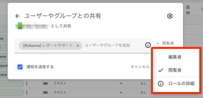 ⑤共有したいメールアドレスを入力し「編集者」「閲覧者」を選択してください