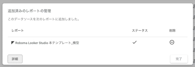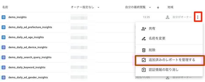 右の三点メニューから「追加済のレポートを管理する」から、このデータソースが使用されているレポートを確認できます