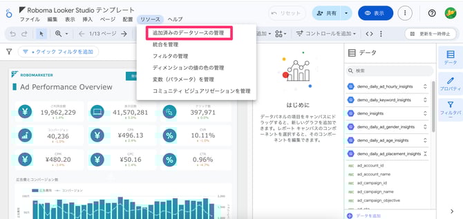 - メニュー「リソース」>「追加済みのデータソースの管理」を選択します