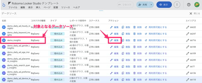 RobomaのBigQuery出力では、媒体名、キャンペーン目的は以下の通り出力されています。