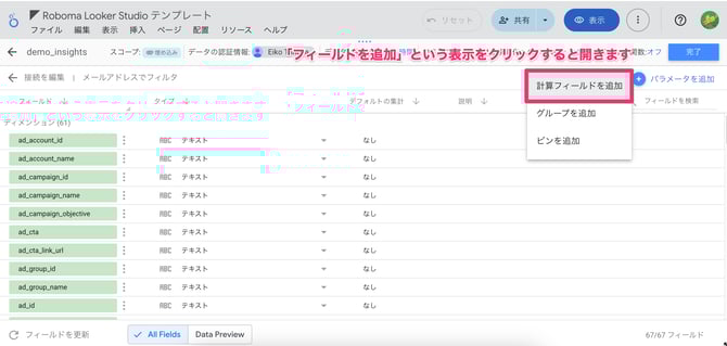 広告Robomaでは、Looker Studioの計算フィールド機能を活用して、広告データをより分かりやすい形で表示できます。このページでは、広告媒体名を統一的に表示するための計算フィールドの作成方法について説明します。