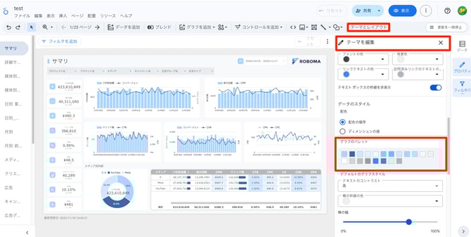 「テーマを編集」のプロパティが表示されたら、「データのスタイル」のグラフのパレットを編集することで、レポート全体の配色を変更することができます。