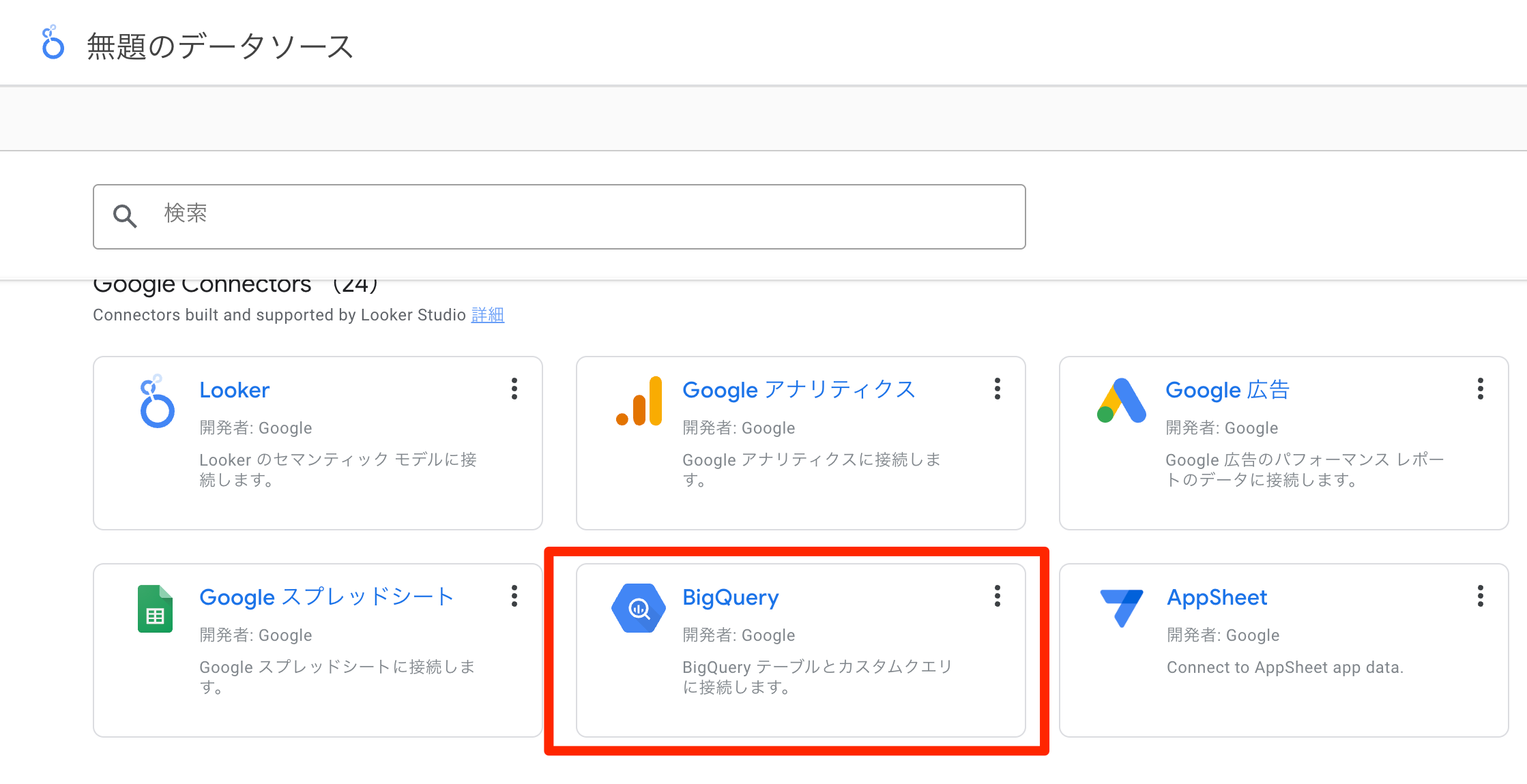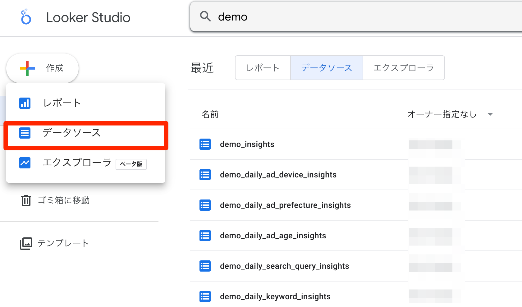 Looker Studioのトップの「作成」>「データソース」を選択します