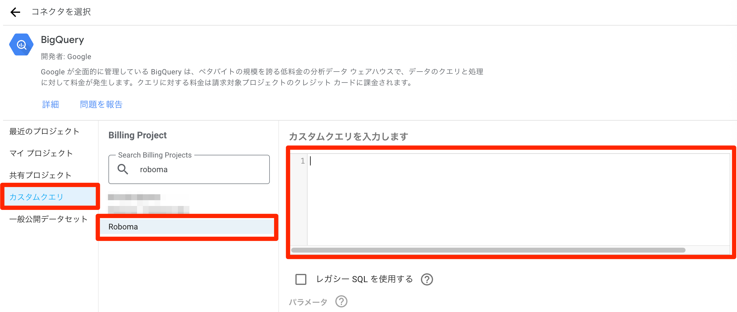 ③BigQueryの左メニューの「カスタムクエリ」を選択し、対象のProjectを指定します